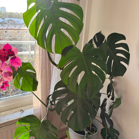 Monstera deliciosa krukväxt i grön färg. Växten har stora, flikiga blad och är planterad i en enkel kruka. Passar som inomhusväxt i hem- eller kontorsmiljö och trivs bäst i ljust läge utan direkt stark sol. Kräver regelbunden men måttlig vattning och kan med tiden bli stor med långa rankor.