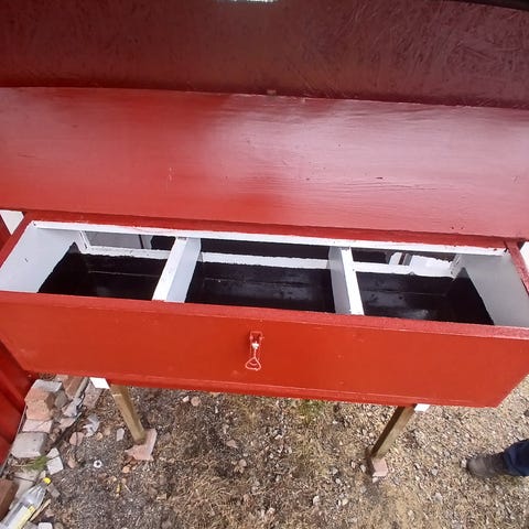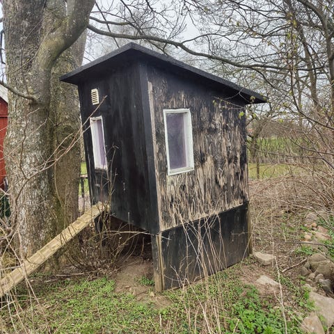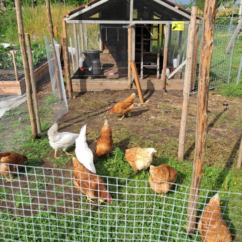 Plåttak, stuprör, isolerad, plåtlucka för utgång, sittpinne, reden till hönsen, el, trappa