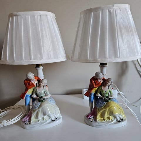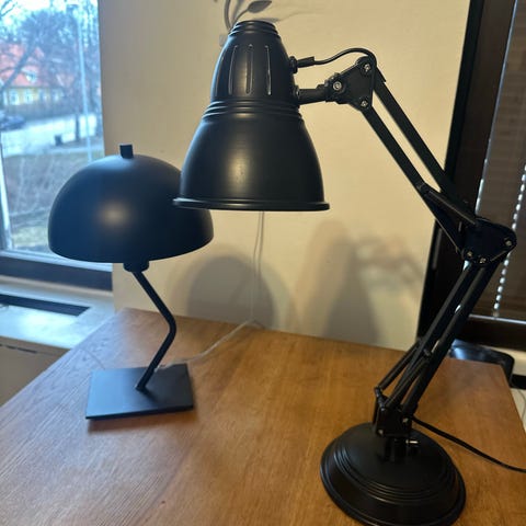 Ikea bordslampor med tygskärmar. Två mindre lampor med mörkblå veckade skärmar och en större lampa med beige mönstrad skärm. Lampfötterna är i ljus ton med detaljer i mässingsfärg. Passar som belysning i exempelvis vardagsrum, sovrum eller hall. Formgivare: Anders Pehrson.