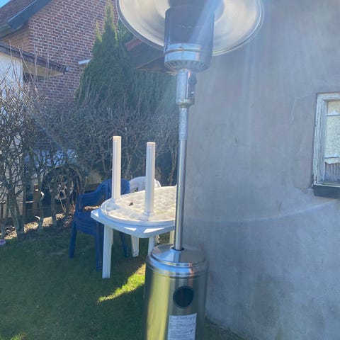 Terrassvärmare gas stående modell för utomhusbruk. Placeras på altan, balkong eller i trädgård för att ge värme vid svalare väder. Utrustad med rund reflektorskärm upptill som sprider värmen nedåt. Drivs med gasflaska som ansluts i foten (gasflaska ingår inte). Höjden är anpassad för att stå på golv eller trall. Lämplig för användning vid sittgrupper och uteplatser där extra värme önskas.
