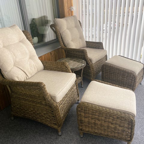 Soffbord i konstrotting. Bordet är rektangulärt har flätad rottingbas och en plan glasskiva ovanpå. Höj och sänkbart. Nytt och inte ihopsatt. Ligger kvar i kartongen.