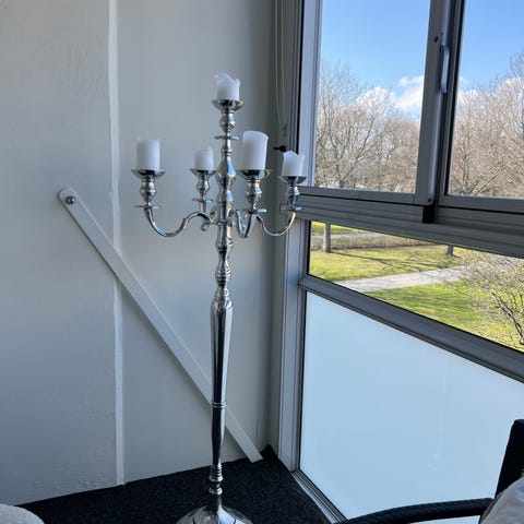 Fem armad kandelaber från Dorre i aluminium, cirka 100cm. Finns att hämtas i Gunsta.