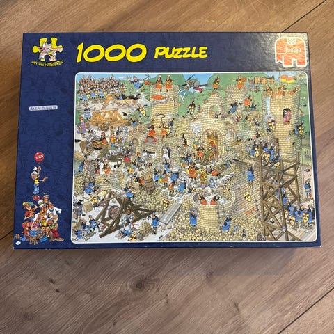 Jan van Haasteren pussel med 1000 bitar. Flera olika motiv i färgglada och detaljrika illustrationer. Pusslen är avsedda för vuxna eller äldre barn som gillar utmanande motiv med många detaljer.
