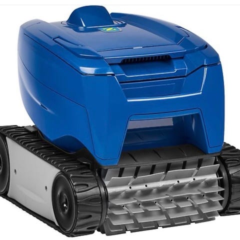 Poolrobot från raptor, med extern styrbox och lång blå kabel. Enheten är avsedd för automatisk rengöring av poolens botten och väggar. Robotens hölje är i ljus plast med mörkare detaljer och har bärhandtag för enklare hantering. Styrboxen ansluts till eluttag och reglerar robotens funktioner via den fasta kabeln. Produkten passar för användning i privata pooler där man vill ha automatisk rengöring av vattenlinje och botten. Exakta mått, modellbeteckning och kapacitet framgår inte av bilderna utan behöver kontrolleras mot märkning på produkten eller manual.