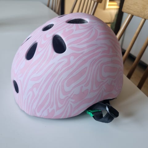 Bell cykelhjälm i orange färg med dekorativt mönster på sidorna. Hjälmen har flera ventilationshål upptill och justerbart hakband i lila med snabbspänne. Invändigt finns stötdämpande frigolitkärna och vaddering för bättre passform och komfort. Passar för cykling och liknande aktiviteter där huvudskydd behövs.