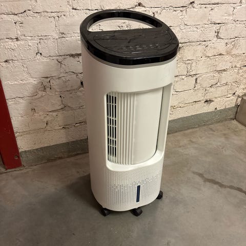 Icecool luftkylare i vit färg. Golvmodell med frontgaller och kontrollpanel upptill. Utrustad med vattenbehållare i nederkant för kylfunktion. Passar för användning inomhus för att kyla och cirkulera luft i rummet.