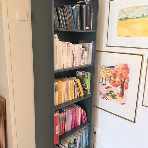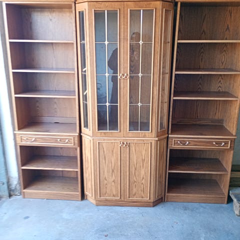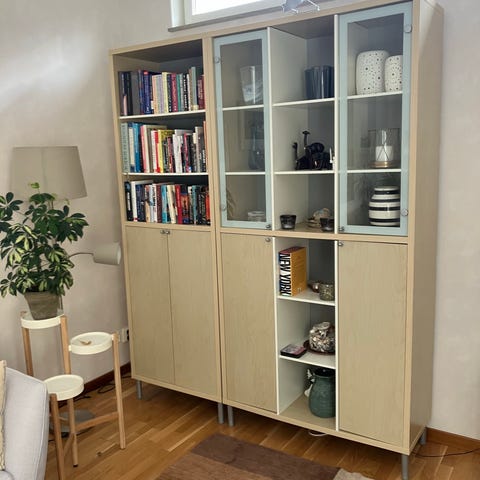 Två st. Bokhyllor i fint skick , lantlig stil , med fina detaljer , kan sättas ihop till en hel eller delas som på bilderna , rymmer mycket böcker , om man skulle vilja använda dem som vitrinskåp så finns det glasdörrar att köpa till på IKEA , 1000 kr st. Eller 1500 får båda två !