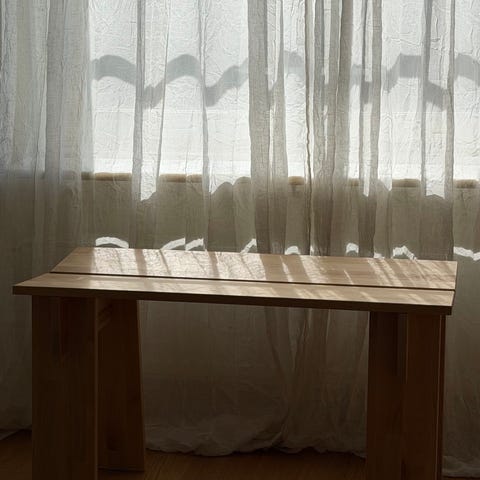 Fin sittbänk i grått tyg och bambu.