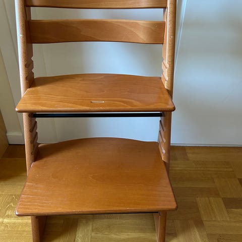 Justerbar barnstol i trä, som är eller liknar Tripp Trapp Stokke (vet ej).