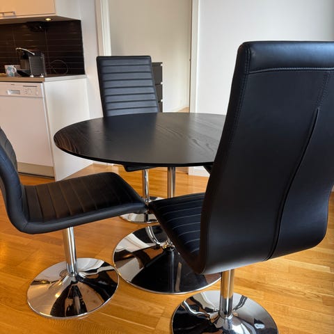 8 st stolar i svart skinn, passande till matbord. Märke: BoConcept, modell 1375 Mariposa.