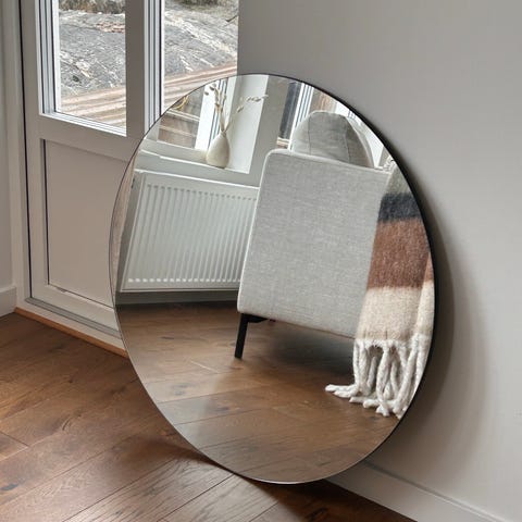 AYTM rund spegel. Cirkelformad väggspegel med tunn svart ram och gråtonat spegelglas.