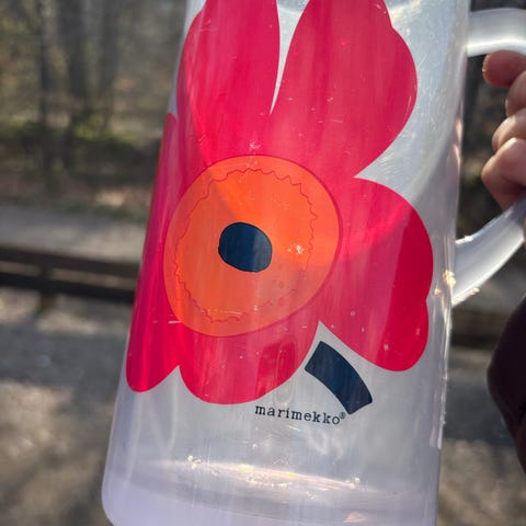 Bringare 1,75 liter i plast och 8st plastglas 10 cm höga i Marimekko (se skicket på bilderna)
