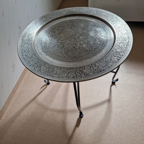Super fin antik sidobord säljes, vitstomme och kopparskiva med älgmotiv.