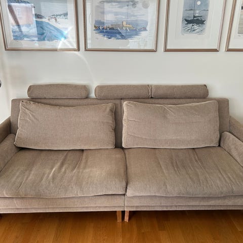 Soffa från Mio, inköpt 2021. 3-sits med schäslong. Ljusblått tyg. Dynornas klädsel är avtagbara och tvättbara. Mycket bekväm. Djur och rökfritt hem.