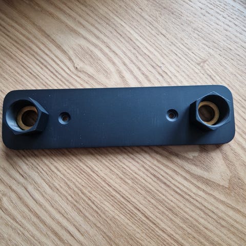 Duschblandare i svart utförande. Modellen har två vred/anslutningar upptill och en anslutning framtill/under för duschslang eller rör. Passar för montering i dusch eller badrum där måtten och anslutningarna är 150CC