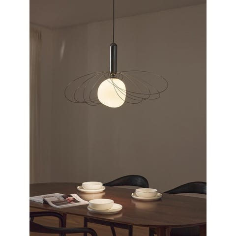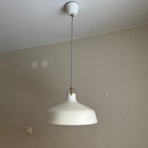IKEA taklampa i svart metall med trådad skärm. Lampan hängs i taket med medföljande takkopp och sladd.