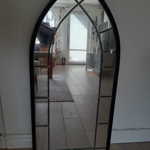Säljer en spegel med en elegant spetsbåge. Spegeln ramas in av mörk metall och har dekorativa svängda smidesdetaljer nertill.
