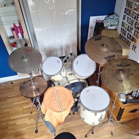 Ett trumset i helt ok skick som lämpar sig mycket väl för den nya spelaren samt även för den mer vana.