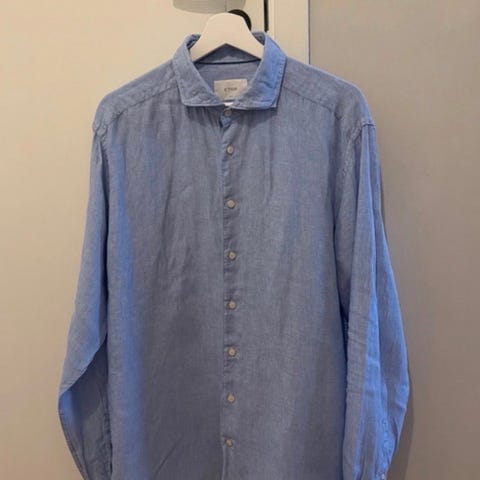 Säljer en stilren linneskjorta från John Henric i ljusblå/vit randig design. Perfekt för både vardag och sommarens lite mer uppklädda tillfällen.