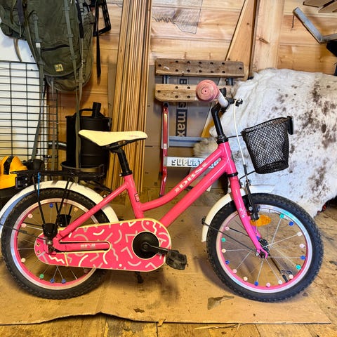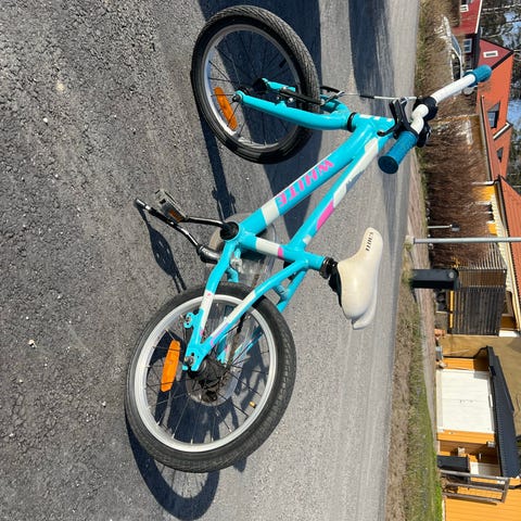 Passa på att köpa en fin BTwin barncykel med 16" hjul i blå och rosa färg.