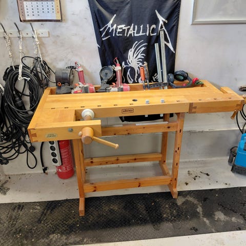 Arbetsbänk i metall med blå yta. Bänken har rektangulär bordsskiva och är utrustad med hjul på benen för att kunna flyttas vid behov. Lämplig som arbetsbord i verkstad, garage eller hobbyutrymme. Mått enligt bilder med måttband, höjd och exakta dimensioner kan kontrolleras vid behov på plats.