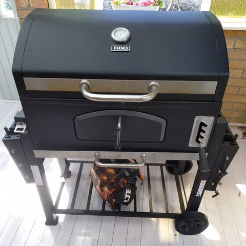 Rondell kolgrill med lock och inbyggd termometer samt separat vedeldad pizzaugn i metall. Kolgrillen har rektangulärt grillgaller, skorsten, handtag framtill och förvaringshylla under. Pizzaugnen är vedeldad med rundad topp i metall, skorsten, frontöppning med trähandtag och avställningsyta under. Båda enheterna är fristående och avsedda för utomhusbruk vid grillning och matlagning över kol eller ved.