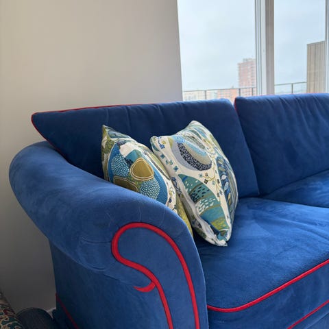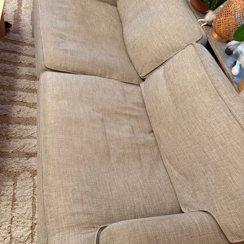Soffan beställdes med ett tillval med avtagbart skyddstyg på armstöden (syns på bild).