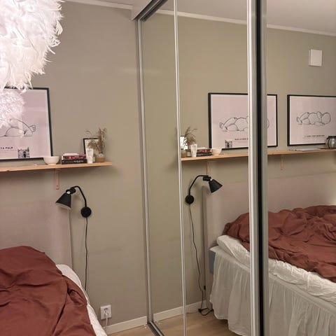 2st spegeldörrar mått 50x200cm. Passar ikea garderob 100x200cm. Passar även 2st 50x200cm garderober. Inkl gångjärn. Inkl 2st belysningsslingor (går ta bort).