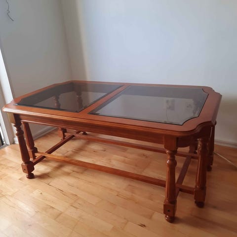 Ovalt soffbord med avtagbar glasskiva. Finns en liten repa i ena hörnet.