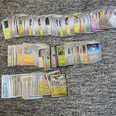 Pokémon samling spelkort med blandade motiv. Flera kort i skyddsfickor samt några lösa kort. Innehåller olika typer av Pokémon-kort, inklusive special- och foilkort enligt bilderna. Lämplig för samlare eller som tillskott till befintlig kortlek. Antal och specifika kort framgår av bilderna.