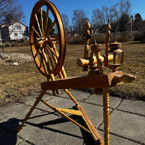 Spinnrock i trä. Traditionell modell med stort hjul och svarvade trädetaljer, naturlig träfärg och synliga ådringar.