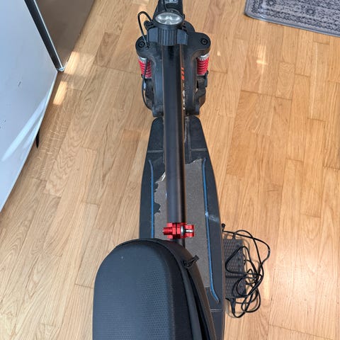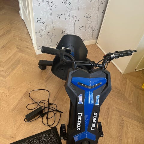 Elektrisk trehjulig scooter i svart färg. Modellen har ett framhjul och två bakhjul för ökad stabilitet. Utrustad med styre med handtag, bromsreglage och display/enhet framtill. Lämplig som elfordon för kortare transporter eller fritidskörning på hårda underlag. Drivs av elmotor och har inbyggt batteri. Sits och fotplatta är integrerade i ramen för en kompakt konstruktion. Nypris 4000kr