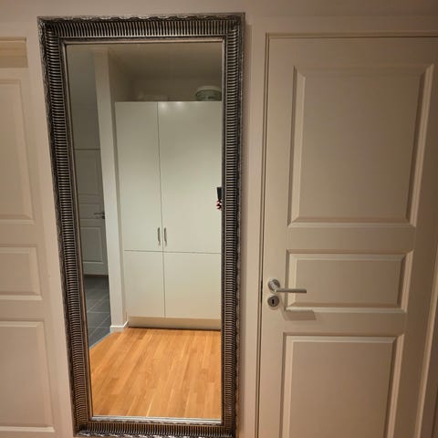 IKEA spegel med svart ram. Rektangulär helkroppsspegel som kan placeras i hall, sovrum eller vardagsrum. Spegeln har en markerad, mörk ram runt om och är avsedd att hängas eller ställas mot vägg. Passar för daglig användning vid påklädning och som inredningsdetalj.