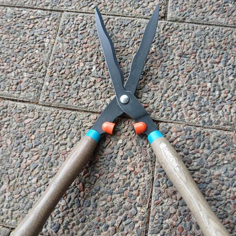 Sekatör grensax med gröna skaft och svarta handtag. Lämplig för beskärning av buskar och mindre grenar i trädgården. Manuellt handverktyg med två handtag för ökad kraft vid klippning.