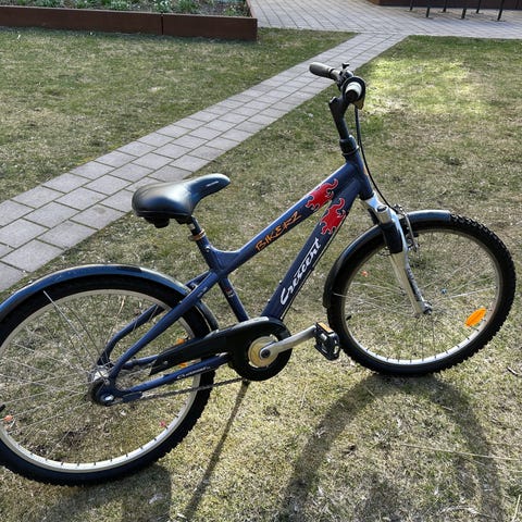 Scott barncykel med 24" hjul. Cykeln har blå ram med raka styre och fotstöd. Utrustad med handbromsar fram och bak samt reflexer på hjulen. Passar barn som växt ur mindre barncyklar och behöver en större cykel med 24-tums hjul för vardagscykling och fritidsbruk.