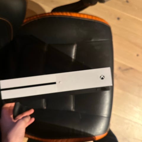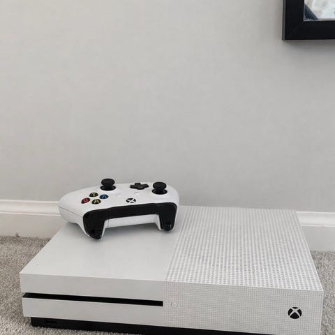 Microsoft Xbox One S spelkonsol i vit färg. Stationär konsol med optisk skivenhet på framsidan.