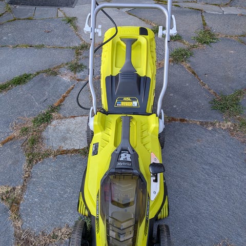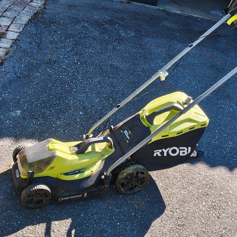 Ryobi gräsklippare 36V. Batteridriven modell med uppsamlare baktill. Passar för klippning av gräsmatta i trädgård och andra grönytor. Handtag med justerbar höjd och hjul för enkel manövrering.