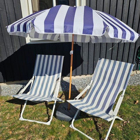 Ställbara positionsstolar med randigt tyg i blå och vit med metallram.