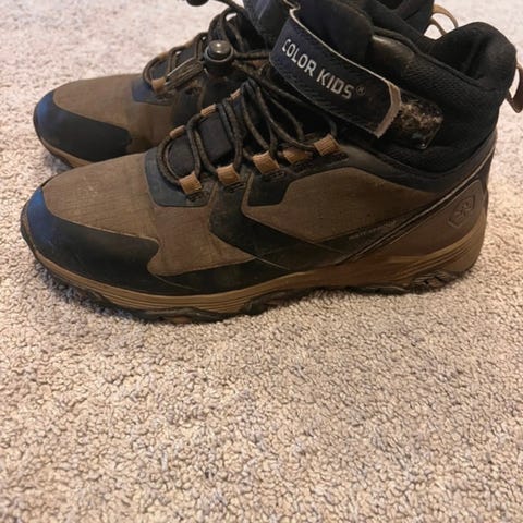 Ett par svarta kängor med snörning och kardborreband. Kängorna har en robust sula och är fodrade för extra värme. De har vita detaljer på sidorna och en namnlapp på insidan.