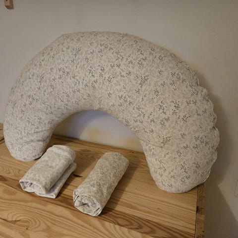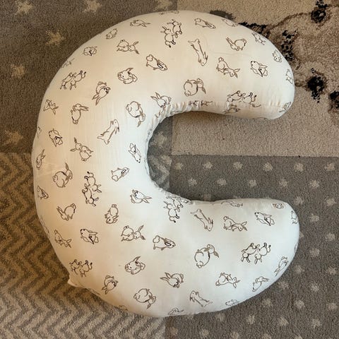 IKEA amningskudde i U-form. Kudden har ett avtagbart vitt överdrag med tryckt djurmönster samt ett extra överdrag i grått. Lämplig att använda som stöd vid amning eller flaskmatning samt som avlastning för förälder och barn. Överdragen kan tas av för tvätt.