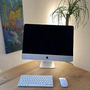 Apple iMac stationär dator med 21,5-tums skärm i silver. Datorn kör macOS Catalina enligt bilden. På bilden syns även trådat Apple-tangentbord och Apple-mus. Lämplig för kontorsarbete, studier och vardagsbruk där en allt-i-ett-lösning önskas med inbyggd skärm och macOS-system.