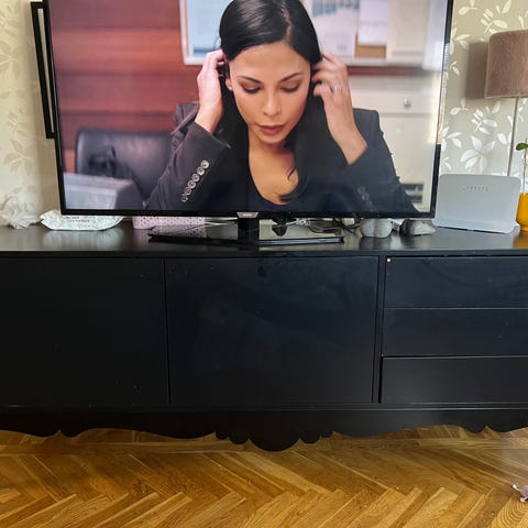 Tv-bänk med bra lådförvaring samt öppen yta. Visst slitage som små repor på ovansidan men inget som är märkbart synligt när man har t.ex. TV och dekoration på.