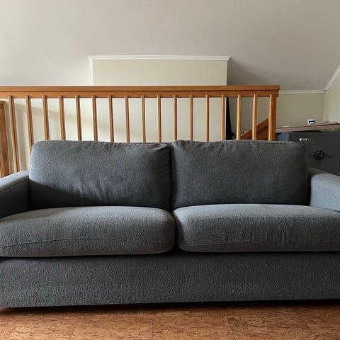 Soffan är ca 10 år gammal, inköpt på MIO med blått tyg.