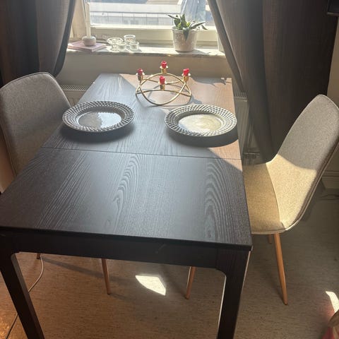 Matbord med ben av massiva ek och bordskiva av ekfaner.