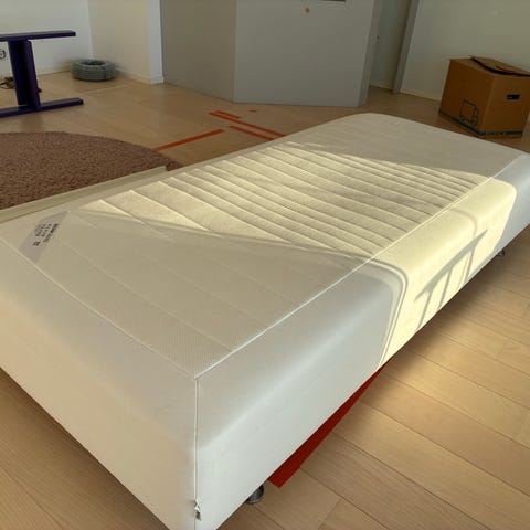 90 cm bred Sultan resårmadrass från IKEA, utan bäddmadrass men inkl ben och en grå vadderad sänggavel. Gott skick och använd av ett äldre barn, så fortfarande bra stuns i resåren.