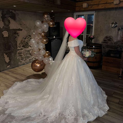 En fantastiskt vacker brudkappa med stor huva ingår. Den ger en sagolik look och faller vackert över klänningen. Perfekt för eleganta utomhusbilder.