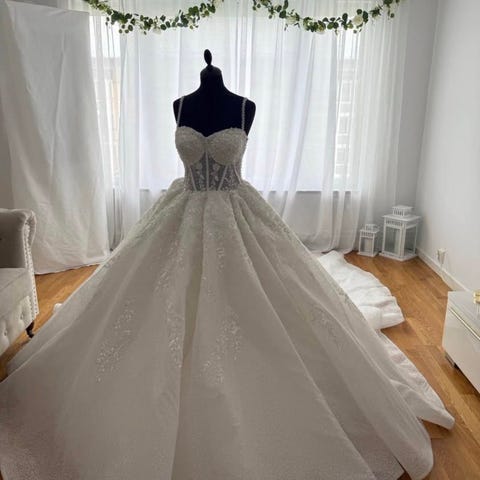 Lyxig skräddarsydd brudklänning med pärlor & långt släp + Paraply + Slöja