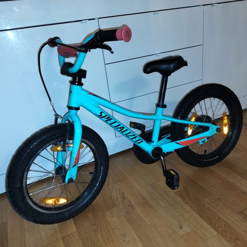 Specialized Hotrock barncykel med 16" hjul. Utrustad med fotbroms bak och handbroms fram samt reflexer fram, bak, i pedalerna och i hjulen. Dessutom fotstöd, ringklocka och snygg design.