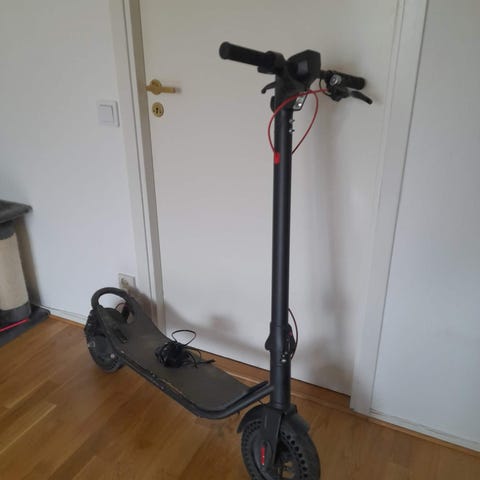 Elsparkcykel i svart färg med digital display på styret. Utrustad med handbroms, ringklocka och gasreglage på styret. Framhjulet har röd dekordetalj och stänkskärm. Passar för persontransport på kortare sträckor på hårda underlag. Drivs av elmotor och batteri som är integrerat i konstruktionen. Avsedd för stående körning med fotplatta mellan hjulen. kör i 25 km/h