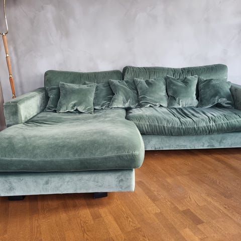 Rymlig stor soffa i mjuk grå sammet med djupt sittdjup och fluffiga lösa kuddar. Perfekt för soffhäng och extra gäster. 7 lösa kuddar ingår.